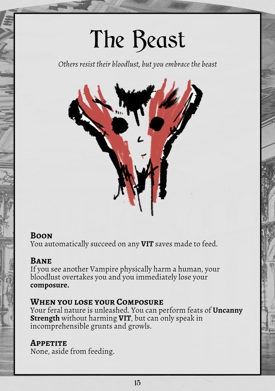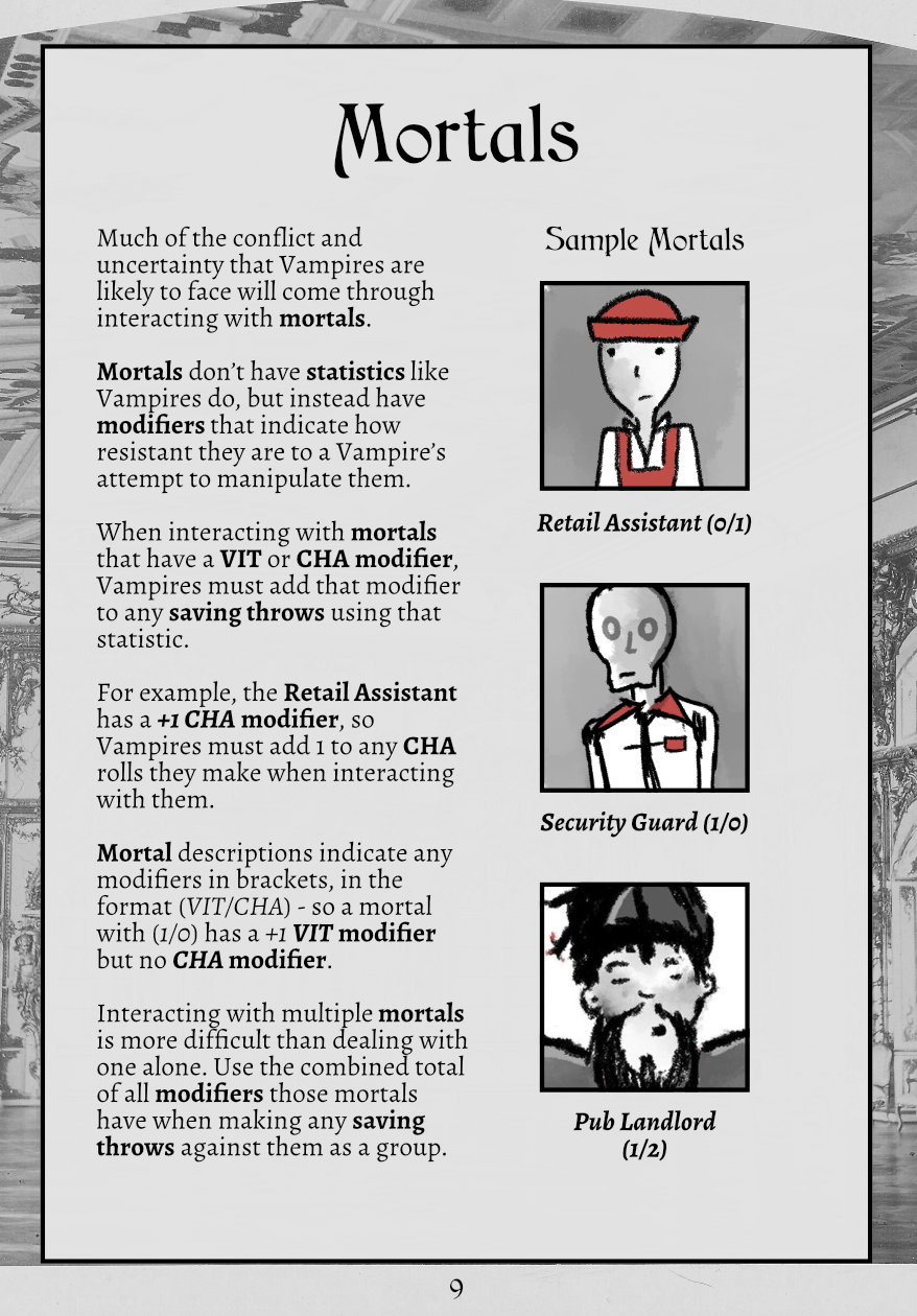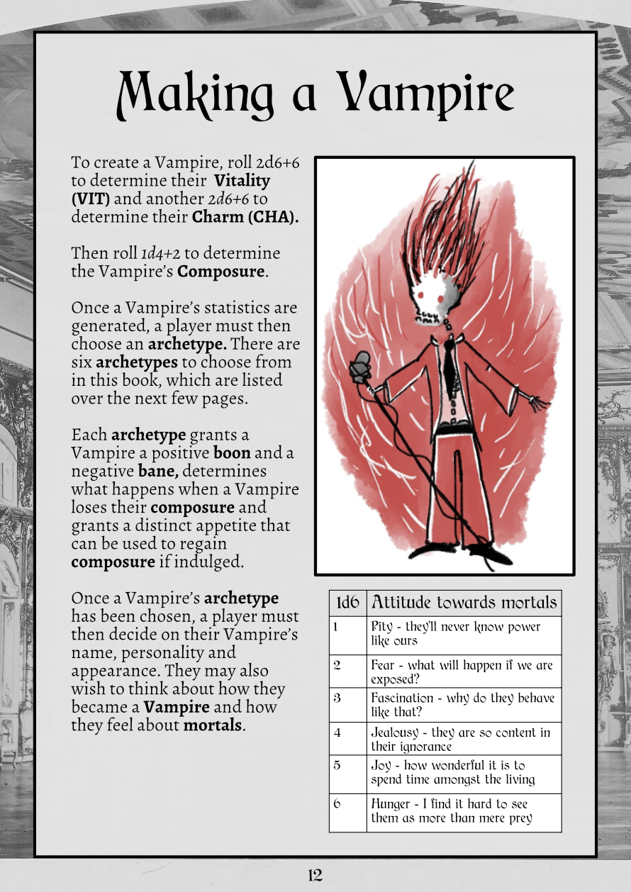 We hope that players will find both humour and tension in the contrast between the normal situations they need to navigate and the horrific power they wield as vampires. Humans can easily be killed, beguiled or terrified, but these apparent solutions are likely to escalate a tricky situation into uncontrollable chaos.